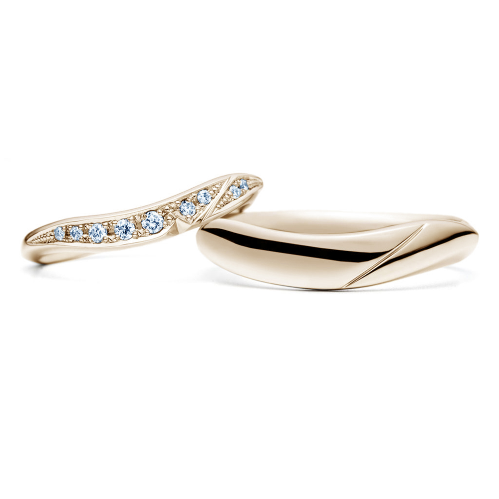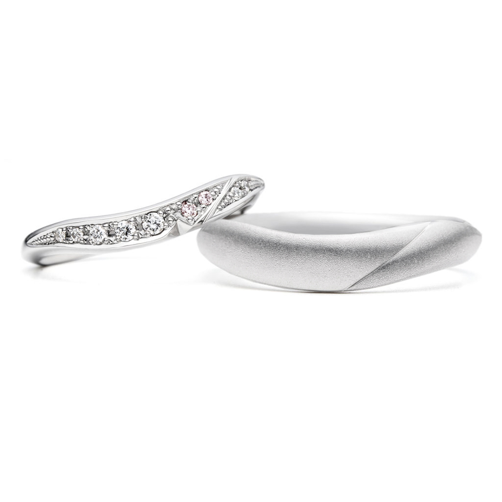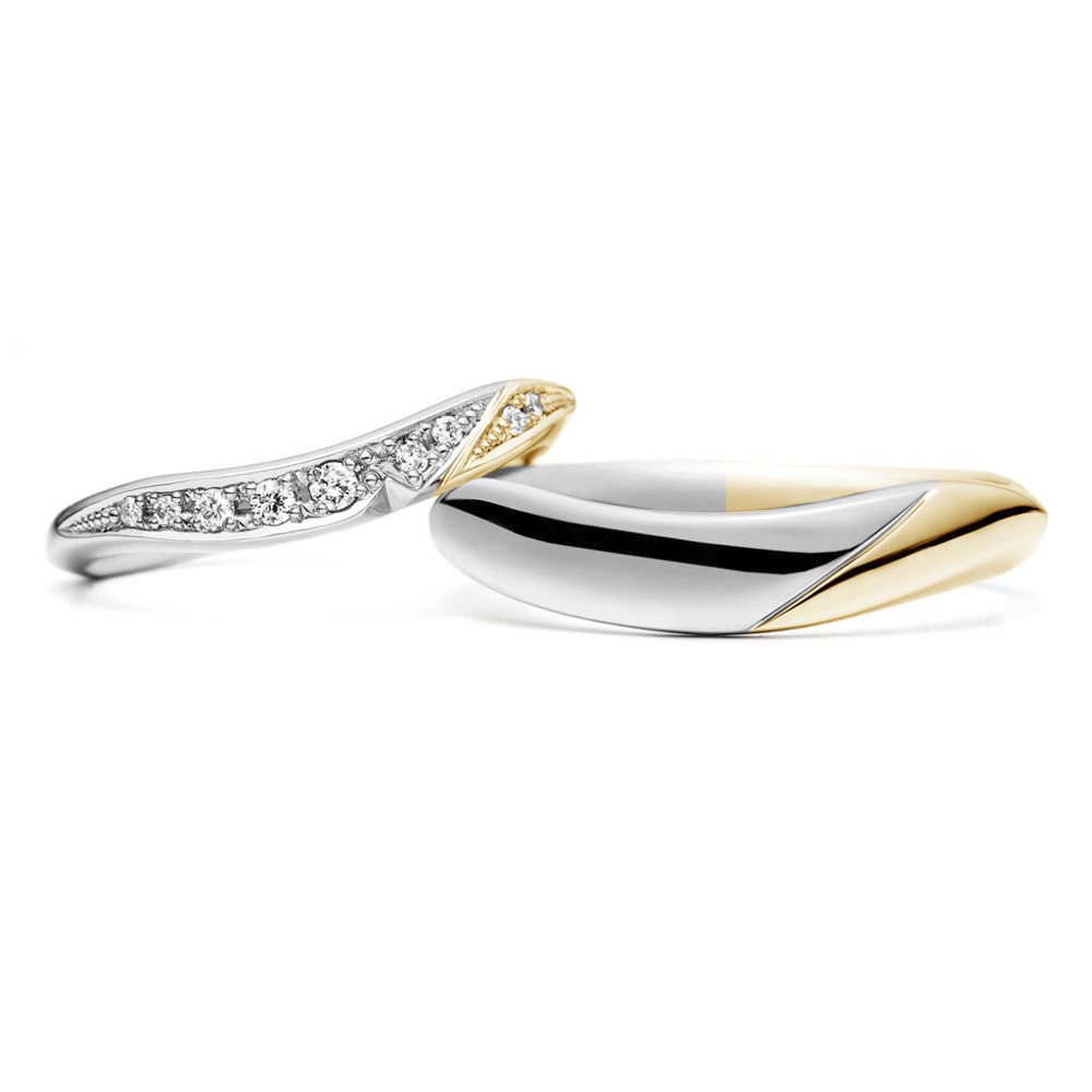 - 左:柔らかなU字ラインを描く細身のデザインです、幅の強弱でより奥行きのある印象になり、正面は大きな葉と小さな葉が重なった様なデザインでメレダイヤモンド(0.02ct×2, 0.01ct×2, 0.005ct×5)を留めて華やかに仕上げています。また正面下に一部くびれをつくることでより有機的な表情が出ています。