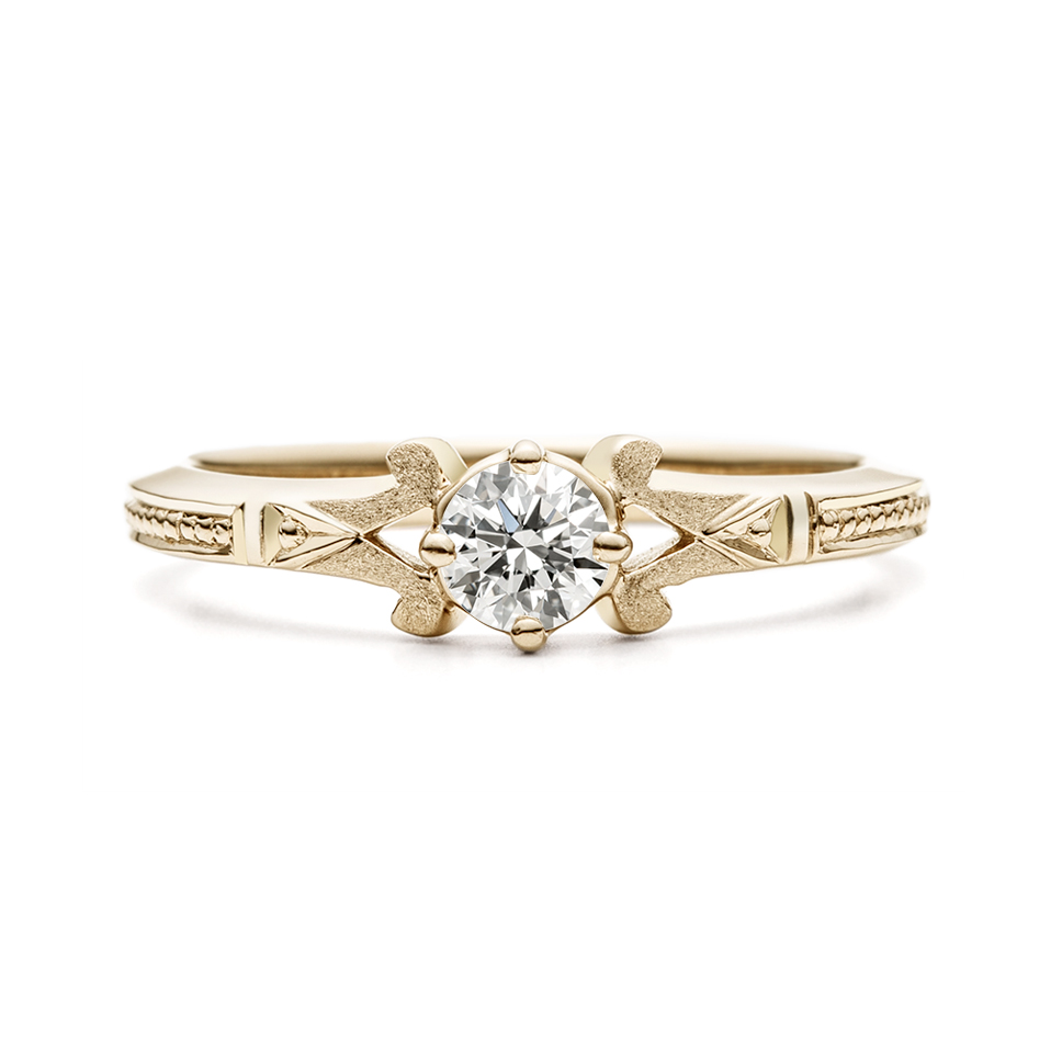 - K18シャンパンゴールドのデザインです。センターダイヤモンドは4本爪です。。石枠はオーソドックスな二段腰のスタイルです。側面からはキューレットまで確認出来ます。腕はシンメトリーのストレートライン。石枠の両サイドで二股に分かれています。こちらの部分のみダイヤバー仕上げとなっており、アンティークな質感が表れています。続く腕には、溝と凹凸で模様を施し、彫りの手法で飾り玉を並べました。指輪側面に傾斜をつけて、表面がより細く繊細に見えるように工夫しています。