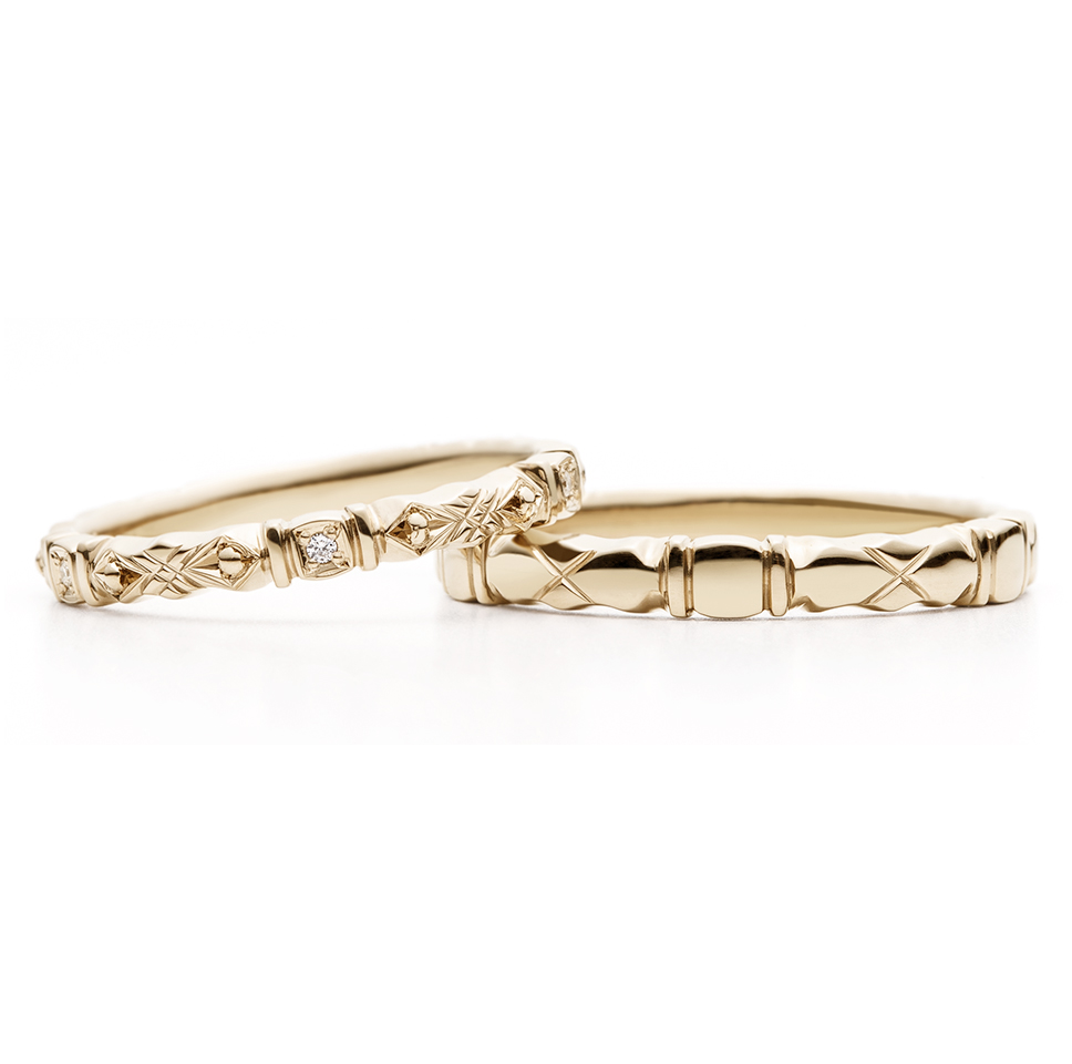 右:K18シャンパンゴールドです。メレダイヤモンドや彫りによる飾り玉は施さない輪郭だけで、デザインを楽しんで頂けます。