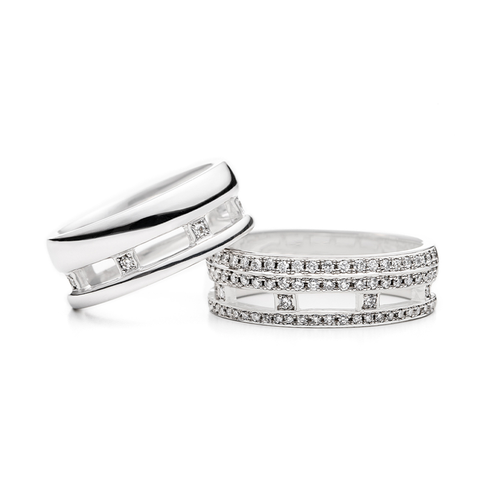 結婚指輪(左)にはそのパーツにメレダイヤモンド(0.01ct×6)を留め、華やかさをプラスしています。空間による軽さと指に通した時の重厚感のバランスが気持ちいい指輪です。