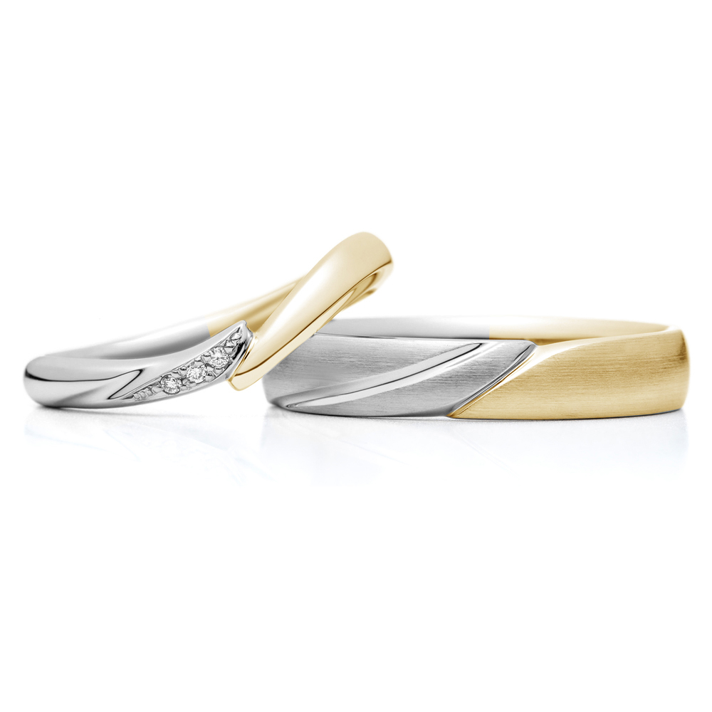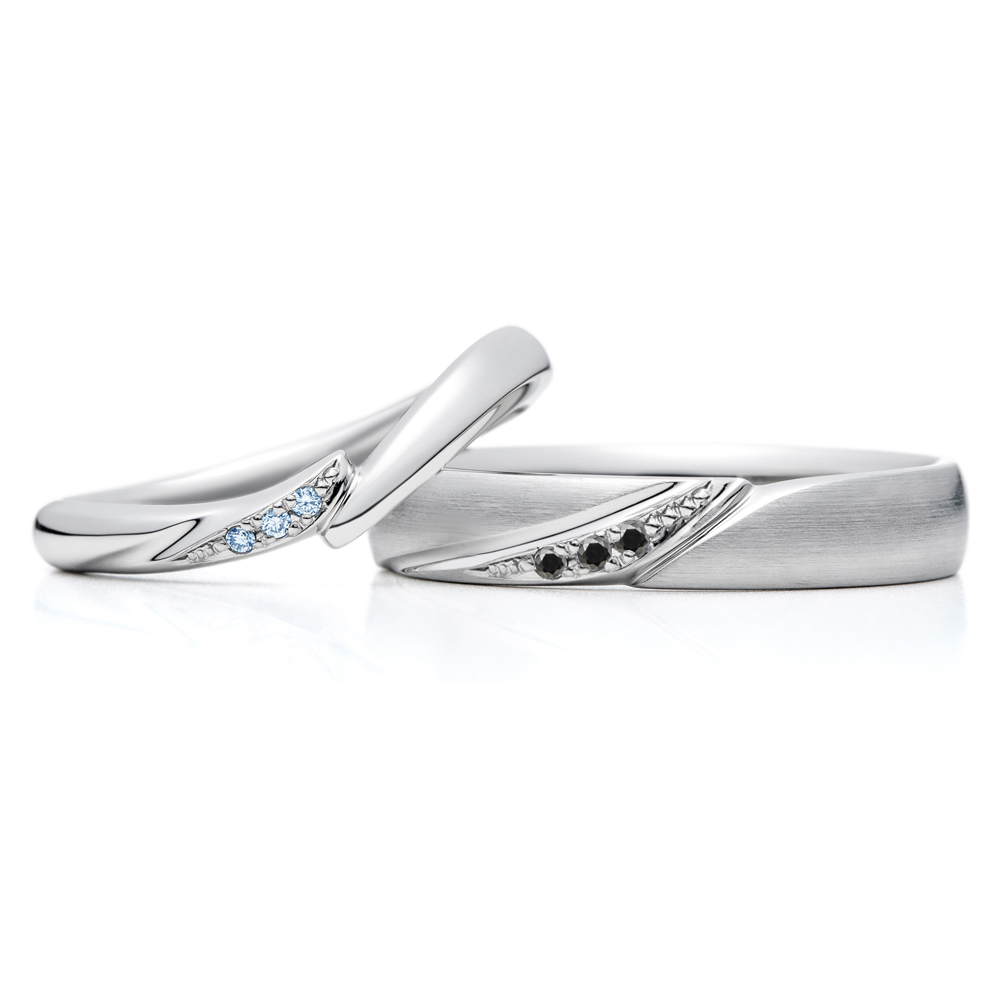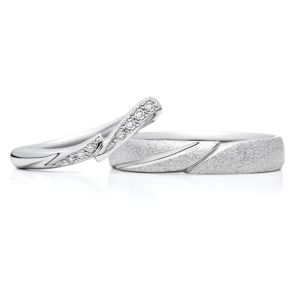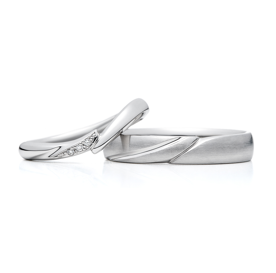 右:幅のあるストレートラインに、結婚指輪(左)正面のデザインを浮かび上がらせています。ウェーブラインとストレートの指輪ですが、デザインのポイントを揃えることでペア感があります。