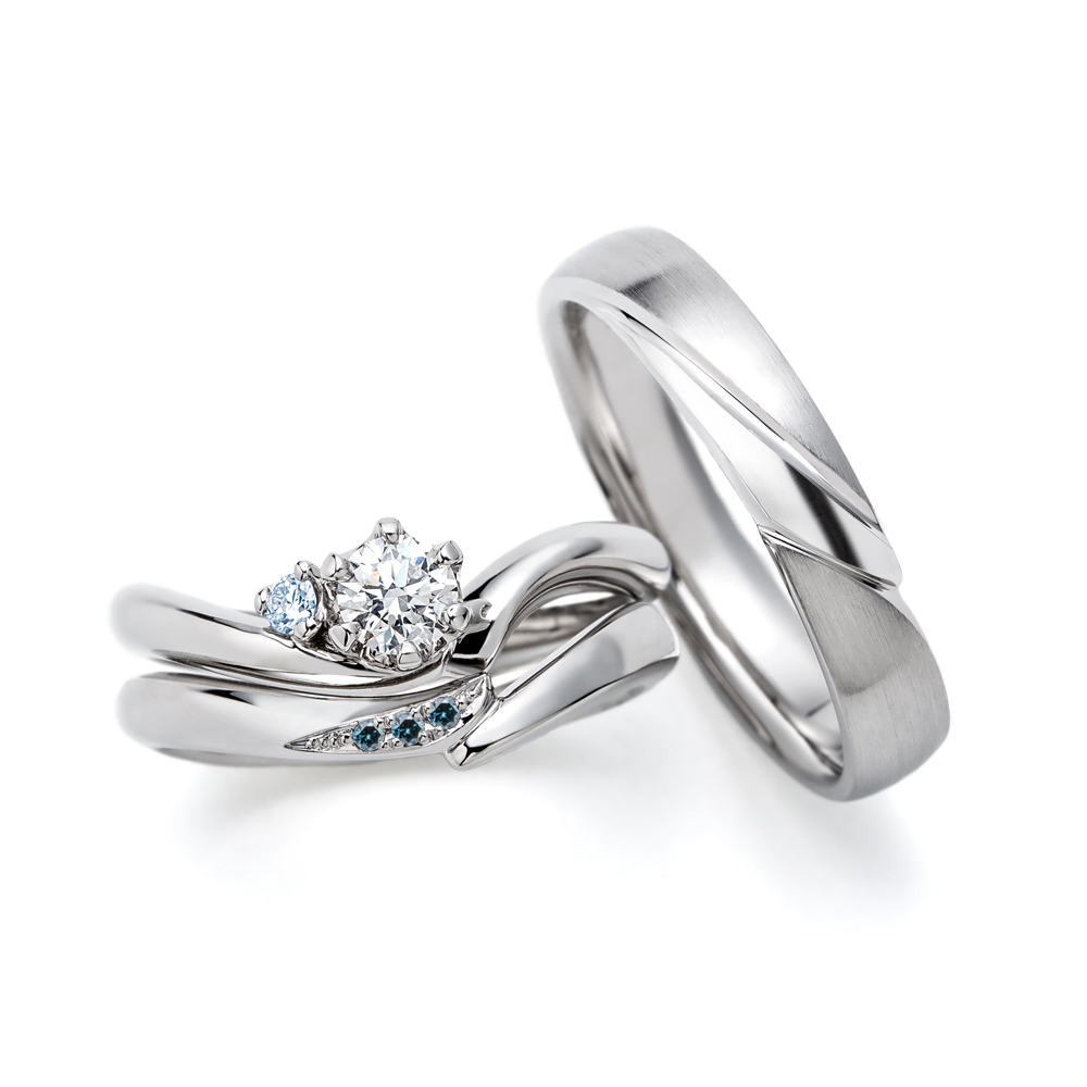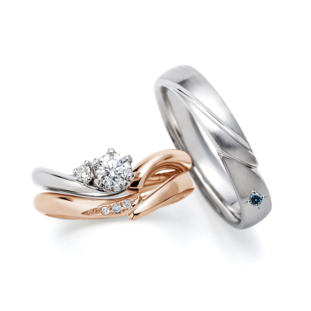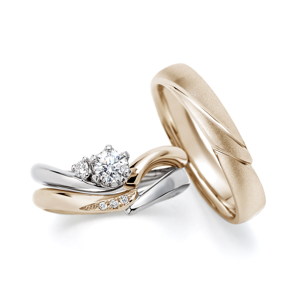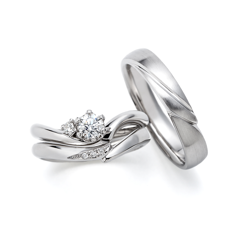 婚約指輪:センターダイヤモンドは6本爪です。センターダイヤモンドの左に、独立した石枠でメレダイヤモンド(0.01ct×1)を留めています。大きくウェーブした腕が特徴です。石枠部分でウェーブが切り返しています。センターダイヤモンドとメレダイヤモンドの大小2ピースは大きな幸せも小さな幸せも大切に届けてくれるイメージです。結婚指輪(ダイヤあり)との重なりも美しく、正面切り返し部分が綺麗に重なります。右の腕の重なりは空間をあけ、軽やかな印象にデザインしています。