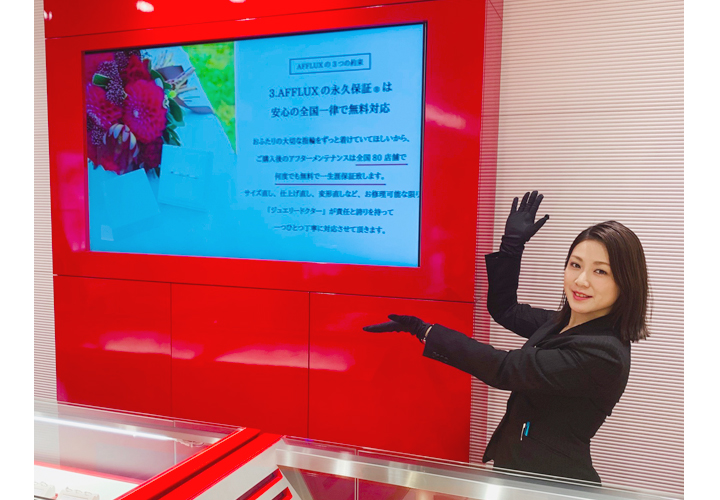 ブライダルリングは全て永久保証書付きで、お選びいただいた1本を末 永く大切に身に着けて頂けるようプロの技術とサービスを全国80店 舗(2023年現在)にてご提供します。AFFLUXの指輪は全て