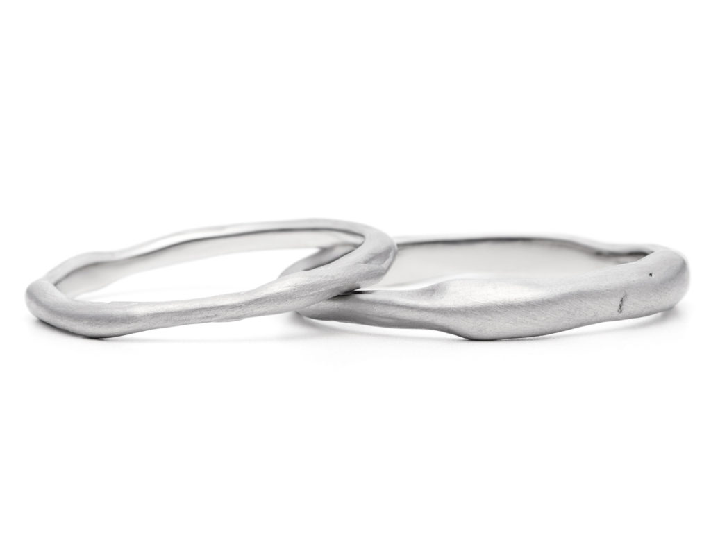 ただ、とても細身で、おふたりの指の長さや手のバランスを考えるともう少しボリュームがあるもののほうが、もっと素敵になるのでは!?とお話すると、おふたりもそう感じておられて、このPrairieに似た感じでおすすめありますか?ということで他の指輪をつけていくうちに、内なるお好みが芽生えたのです。
