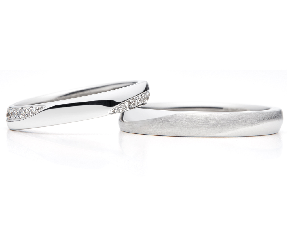 違うデザインではありますが、「ストレートライン」で素材が「スーパーハードプラチナ」であること、さらに指輪の内側に「ブルーサファイア」を留められて共通要素が多く、ペア感もたっぷりです!