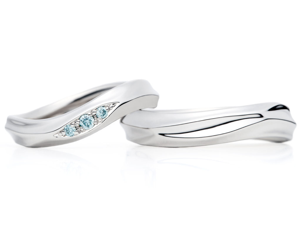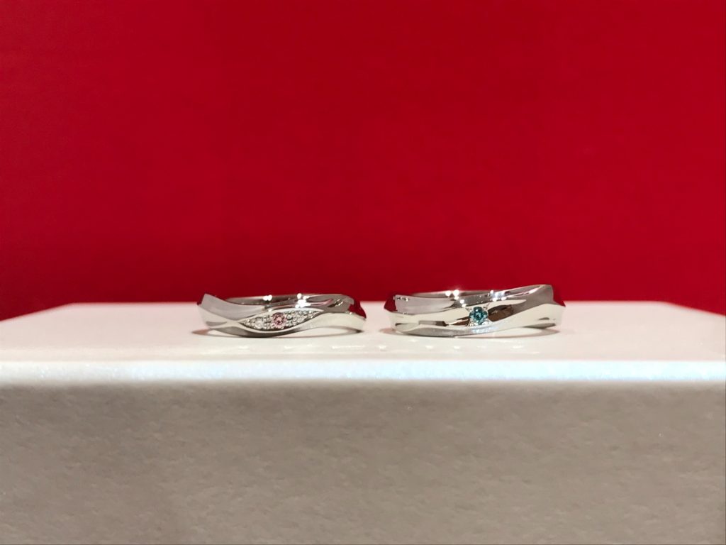 女性側のメレダイヤモンドをピンク、男性側にブルーを入れて