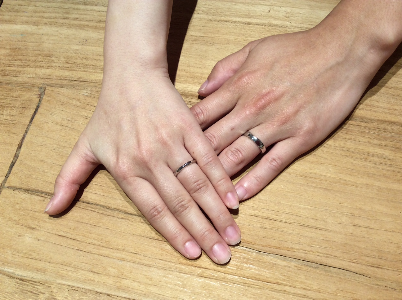 おふたりはプラチナでお造りされ、彼女様はダイヤモンドを無しにして彼氏様とよりペア感をアップしました。