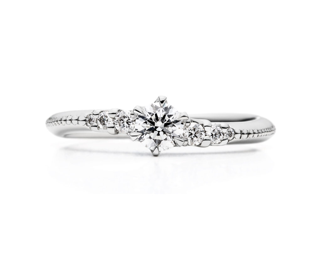 ご婚約指輪はアシンメトリーにメレダイヤモンドが留まっており、花嫁様の花冠をイメージしております。シンプルでありながら他にはない上品なデザインに仕上がりました♥