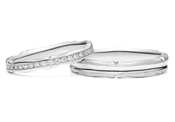 こちらのデザインは、ダイヤモンドが流れに沿って留められているので、いろいろな方向からダイヤモンドの輝きを楽しんで頂けるデザインです。