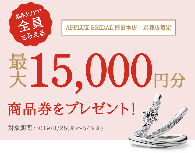 初来店で毎日13:59迄に来店予約された上で、婚約指輪or結婚指輪(ペア)ご成約の方に最大で¥15,000分のギフト券をプレゼントさせて頂いているんです。これは先週より始まった超お得な早期来店キャンペーンで、AFFLUXでも珍しい内容です。幾つかの条件はございますので、詳細はこちらからご覧下さいませ → https://www.a-test.cnxt.jp/news/springfair2019/