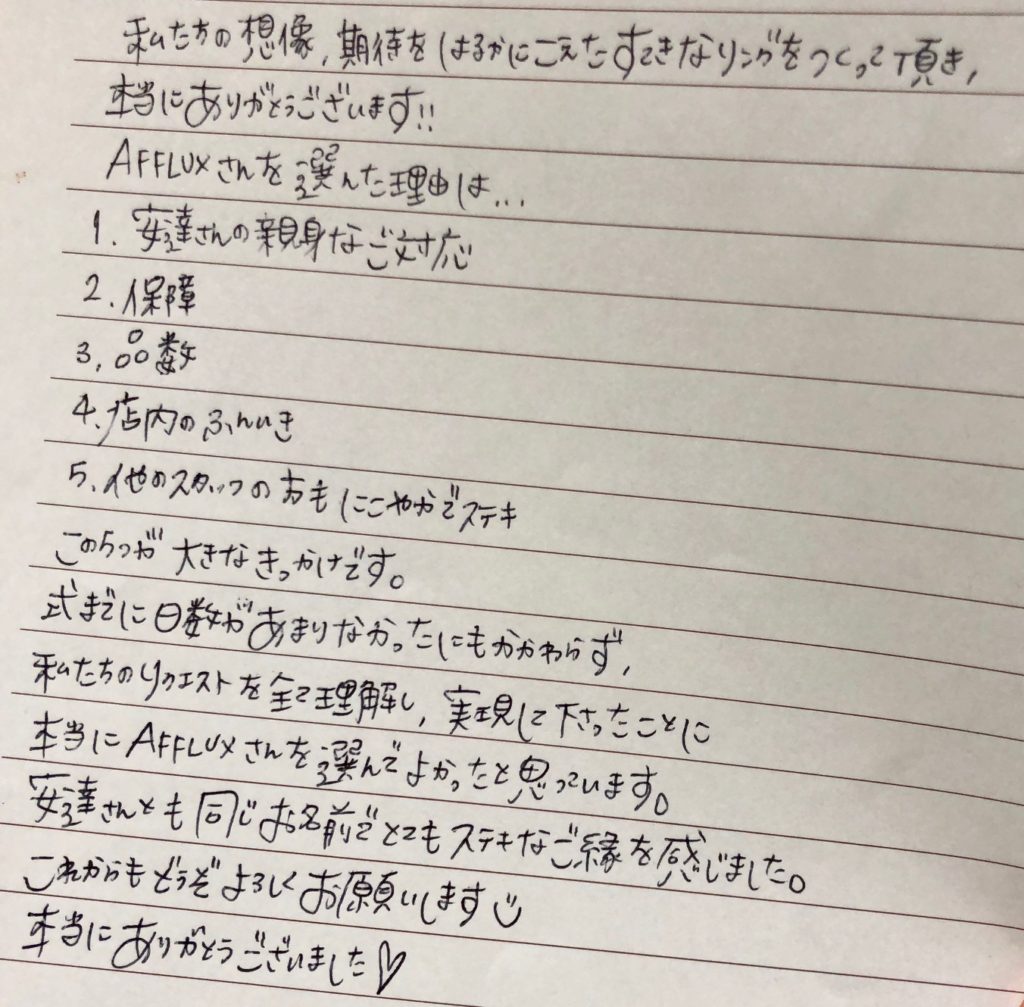 私をはじめAFFLUXがおふたりのかけがえのない人生の一部の彩になれていたら嬉しいです。