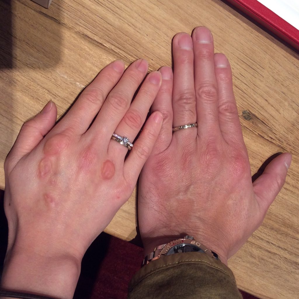 サーフィンが大好きな旦那様、海に思い出があるおふたりらしさが光るご結婚指輪です。