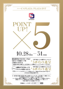この「Sポイント」は通常は110円の買い物やお食事で1ポイントの付与となるのですが、なんと10月28日(木)~31日(日)までは5倍にポイントUPされます。とてもとてもお得です。