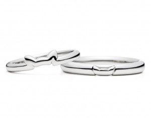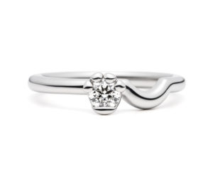 肉球でダイヤモンドをキャッチしている婚約指輪の上にネコ耳の結婚指輪を重ねると愛らしいネコの顔になります。